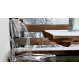 Son dossier arrondi rappelle la forme des médaillons anciens, tandis que le siège est linéaire et géométrique.